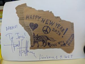 Die Collage des deutsch-chilenischen Künstlers Jorge Armando Ponce Muñoz besteht aus Bildausschnitten aus seinem künstlerischen Animationsfilm BIOMASA. Der Film spielt in einer Zukunft, in der Menschen ihre ursprüngliche Körperlichkeit fast aufgegeben haben. Der Mensch wird in BIOMASA zum Cyborg – in der Kunst durchaus ein Wesen mit utopischen Potential, in der Popkultur eher dystopisch gelesen. Es werden philosophische, ethische, anthropologische Fragen nach dem Verhältnis von Mensch und Technik, insbesondere der Mensch-Technik-Verbindungen und den Grenzen der Selbstoptimierung aufgeworfen.
